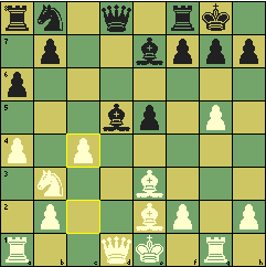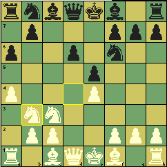 Om vit vill utnyttja svarts tveksamma drag ska han spela Sf3 och följa upp med Lg5. Vit har då tjänat ett tempo jämfört med varianten då vit spelar Le3-g5. 7. - Le7 8. Le2 0-0 9. g4? Med tanke på att vit försvagat sin damflygel med a4 och utvecklat vitfältslöparen till e2 (och inte t ex c4) är en bondestorm av denna typ förfelad. 9. - Le6 10. g5 Se8 11. Tg1 Sc7 12. Le3 d5 Vits avancemang på kungsflygeln har gett svart tid och möjlighet att bryta i centrum. Svart står bättre. 13. exd5 Sxd5 14. Sxd5 Lxd5 15. c4?
