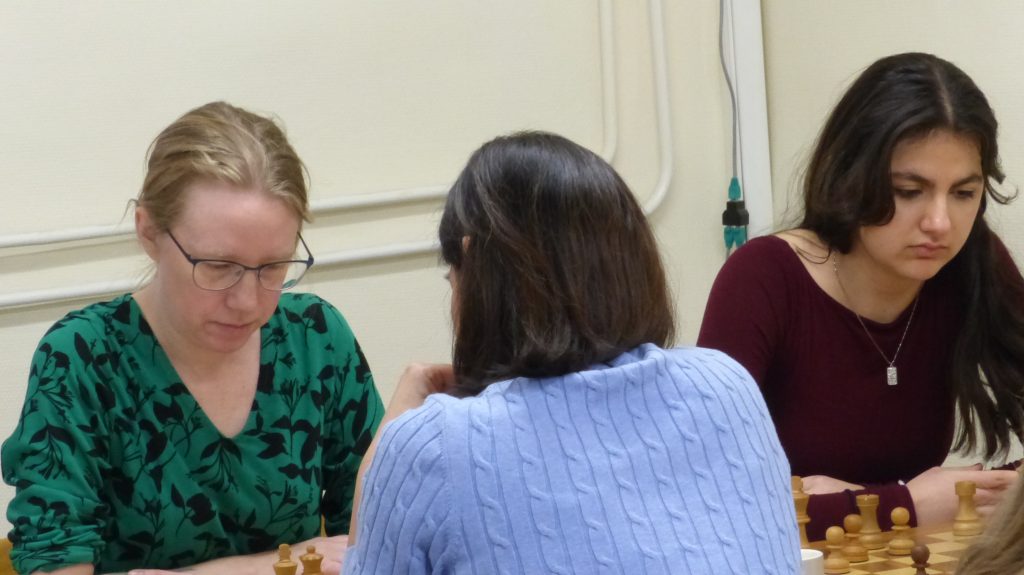 Ofelia funderar mot Linn Olsson, En Passant Svedala, i sista ronden av blixtturneringen. Bredvid Ofelia sitter Azra Bayar, Team Pelaro Alingsås Efter lunchpausen spelades de fyra första ronderna i snabbschacks-SM, med betänketiden 15 minuter plus 5 sekunder per drag, så det blev en ganska ansträngande dag för spelarna.